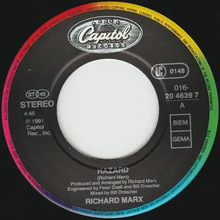 Entdecke „Richard Marx - Hazard“: 3 verschiedene Veröffentlichungen von 1991, aus UK, Europe, Germany - verfügbar als 7'', CD Single & 12''